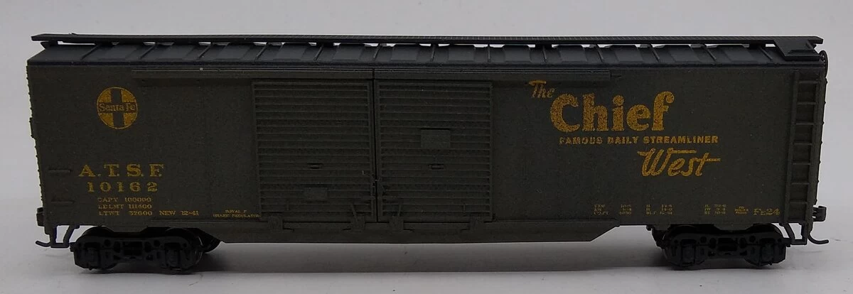 This is an Athearn 92404 HO The Chief Santa Fe 50′ Express Box Car ATSF # 10162. This car features plastic trucks, operating knuckle couplers, metal wheels and axles.
