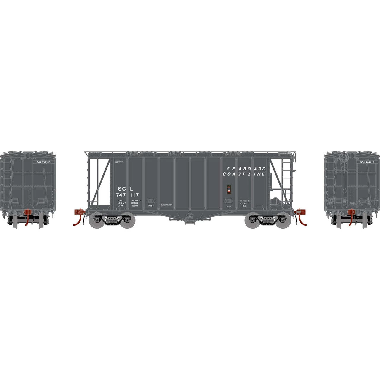 This is a Athearn G87474 HO Scale Seaboard Coast Line GATC 2600 Airslide Hopper #747110. Features: Three different body styles, Rectangular or oval shaker brackets, See-through metal roof walk, Highly detailed, injection molded body, Fully-assembled and ready-to-run out of the box, Detailed underbody including outlet piping, Gravity or gravity-pneumatic outlets, Roller bearing or Bettendorf trucks, Factory installed wire grab irons and brake piping, Coupler cut levers and train air lines, Machined metal wheels, Weighted for optimum performance, Body-mounted McHenry operating scale knuckle couplers, Operates on all popular brands of track, Minimum radius: 18.